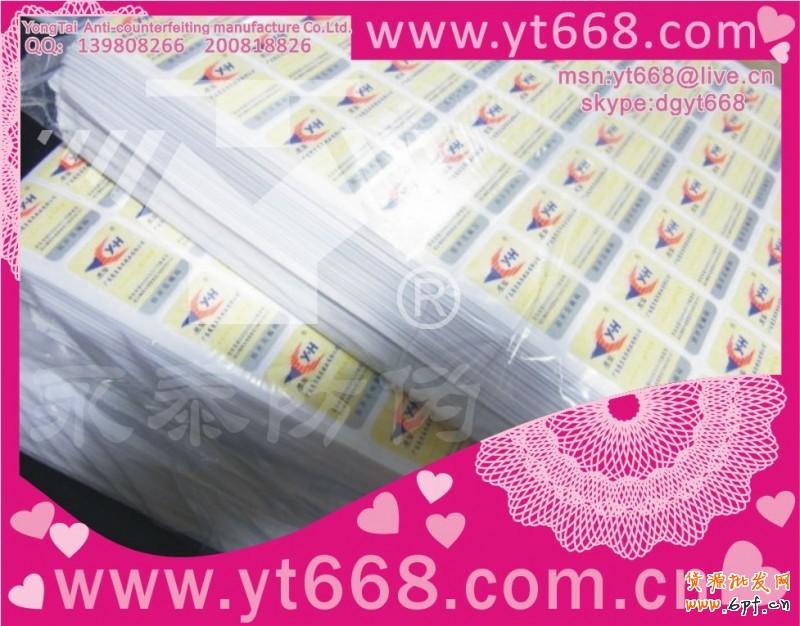 本公司产品皆属于定制品,有意向了解我公司产品可与本公司销售部联系,我们会按照你的要求给您最制作方案及报价。可免费为您提供防伪标签设计,应用说明,技术解释。