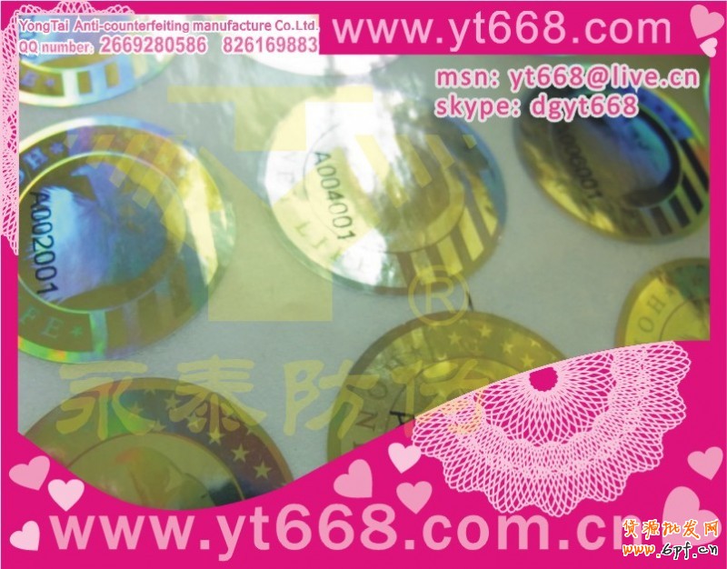 本公司产品皆属于定制品,有意向了解我公司产品可与本公司销售部联系,我们会按照你的要求给您最制作方案及报价。可免费为您提供防伪标签设计,应用说明,技术解释。