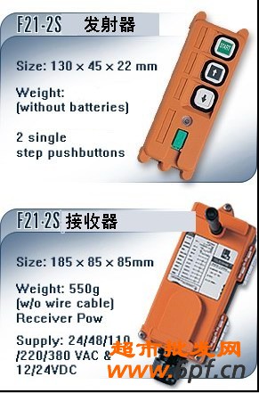 控制距离:可达100米 安全码:43亿种以上出厂永不重复 使用温度:-35℃至+80℃(不考虑电池耐温) 防护等级:IP65 发射器电源:直流3V(2节碱性5号电池可使用4个月) 接收器电源:交流380V/220V可选择,或直流12V/24V 输出触点容量:5安培全密封式继电器输出(使用交流250V/10A继电器,5安培保险丝)。