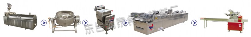 该生产线由炒米机、熬糖锅、搅拌机、铺料机、全自动切块机、冷却输送机、包装机等部分组成。采用智能化人工界面控制技术,变频调整同步,PLC控制切块长度,7道辊筒成型,成型方正良好、切块长度精确、产品重量一致、整机连续生产,实现了对米花糖全自动的生产。