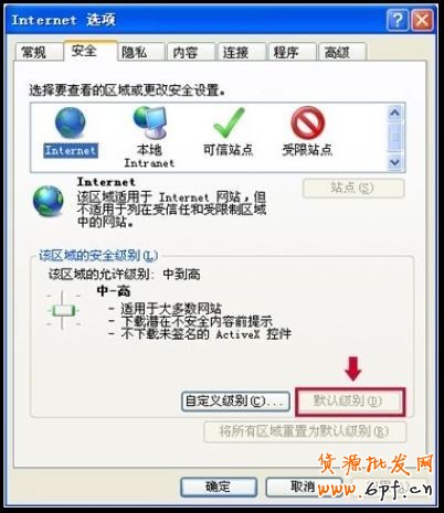 第一步:点击浏览器菜单栏上的“工具”—“Internet选项”—“安全”,选择internet区域,查看下图红框中的“默认级别”按钮,如果不是灰的,请点击按钮,反之,则不做任何操作。