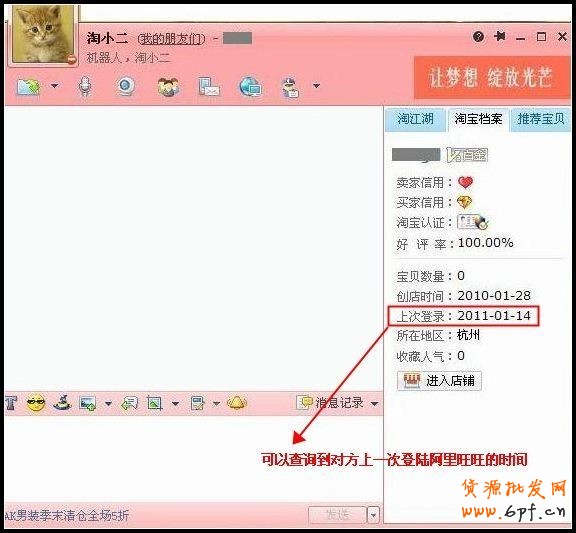 但是您可以查询到上一次登陆淘宝网的时间以及您需要联系的朋友是否登陆过阿里旺旺的情况:
