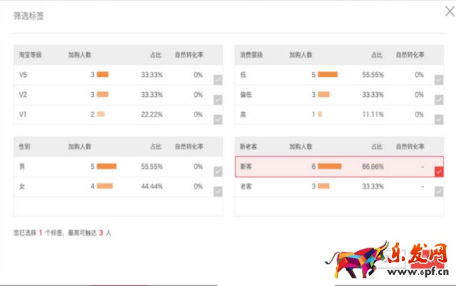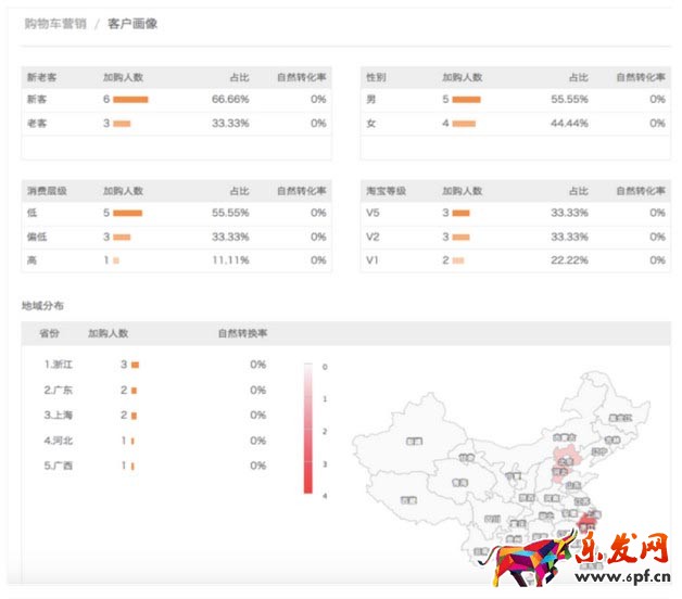 画像纬度,从新客户,性别、消费层级、淘宝等级、地域5个纬度提供人群画像。