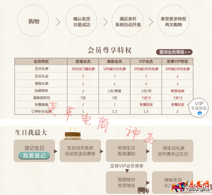 韩都衣舍会员关系体系:通过会员打折、生日特权券、会员日(每月16-18日)和差异化服务不断积累和挖掘老顾客价值;