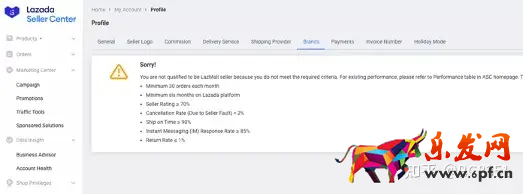 2.如果您点击“Brand ”出现以下页面,则表示你的账户表现暂时不符合入驻Lazmall.