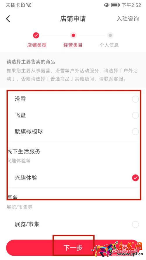 7 打开店铺申请的界面选定经营类型后点击下一步按钮