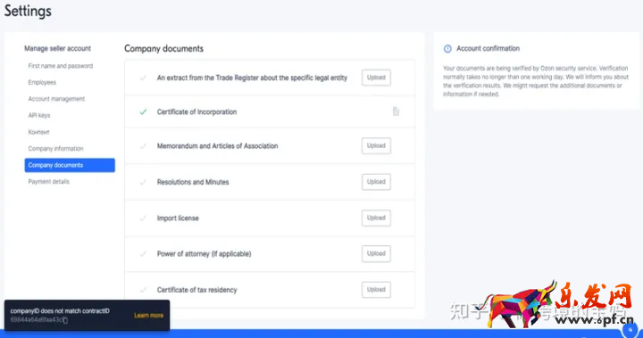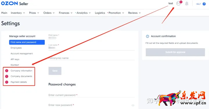 1、进行OZON卖家后台后,请点击右上角头像图标进入卖家信息页面。需要完善左侧带有感叹号标识信息内容。
