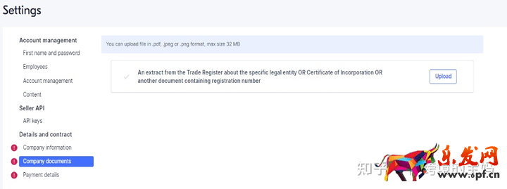 4、在“公司文件”一栏中上传企业文件。中国卖家只需要提交营业执照。将营业执照原件扫描与英语翻译件合并成一个PDF文件并上传在本页的第二栏中。