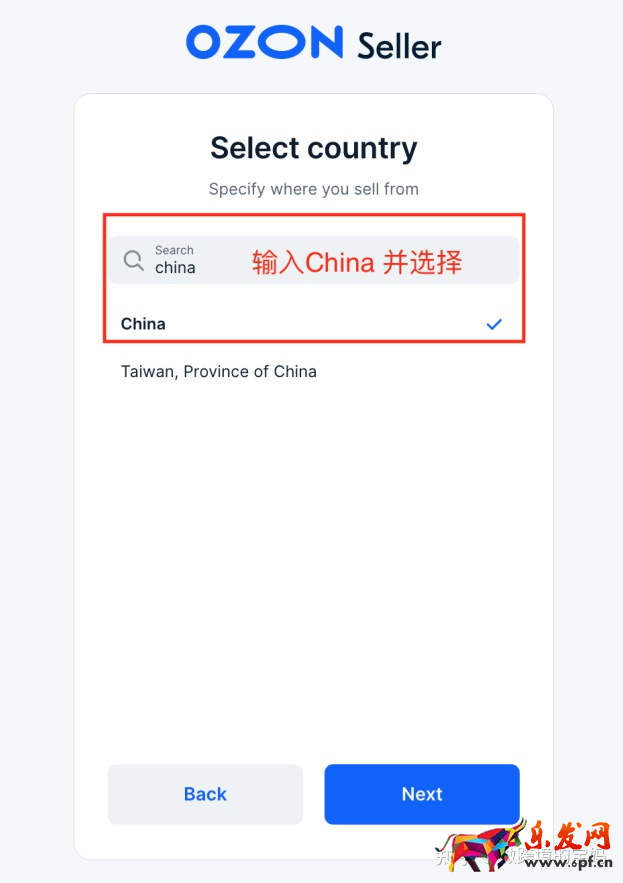 2、选择从哪个国家要发送货物(自发货就选择从国外),搜索选择China