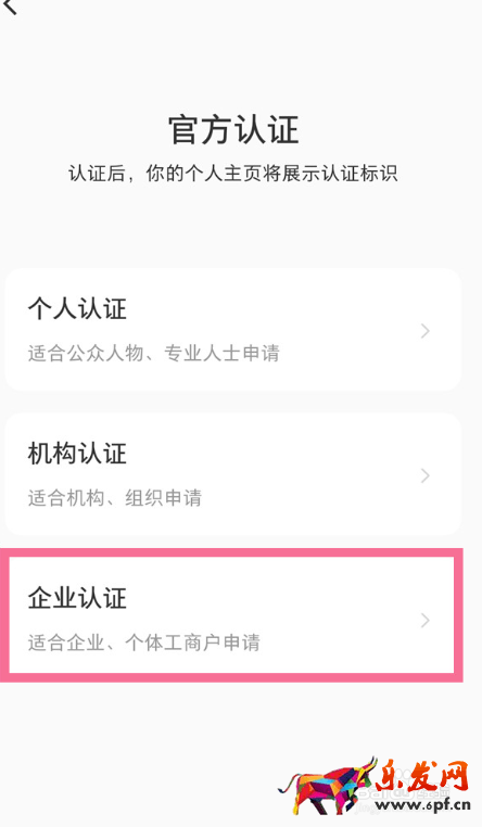 2 然后点击【官方认证】选项,接着点击【企业认证】。